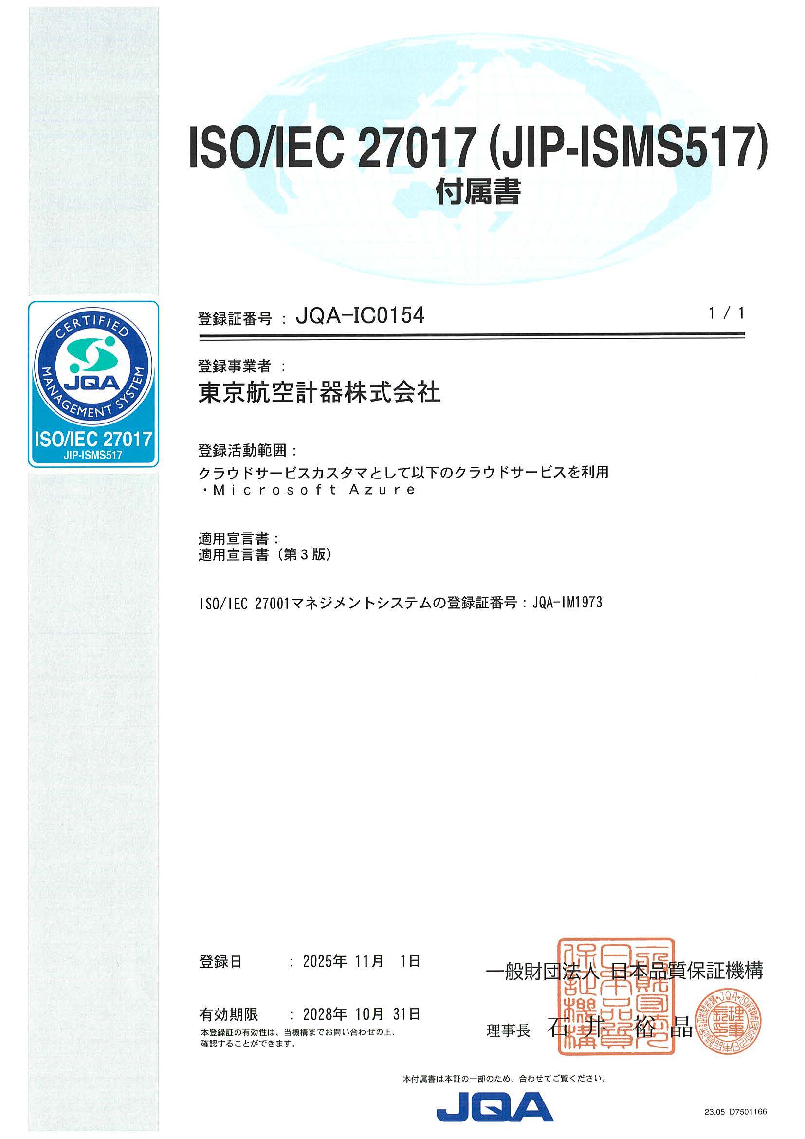 当社は、国際規格 ISO/IEC 27001:2022 及び ISO/IEC 27017(JIP-ISMS517-1.0)の認証を取得しています。「情報セキュリティマネジメントシステム(ISMS)及び クラウドサービスのための情報セキュリティマネジメントシステム」を継続的に改善し、情報保全に努めています。